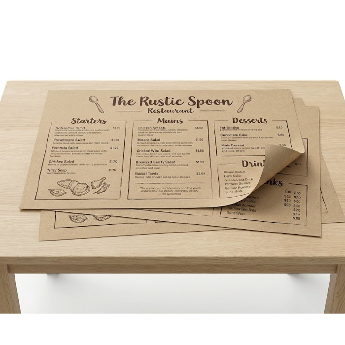 Custom printed table mats for restaurants, events, and promotions.