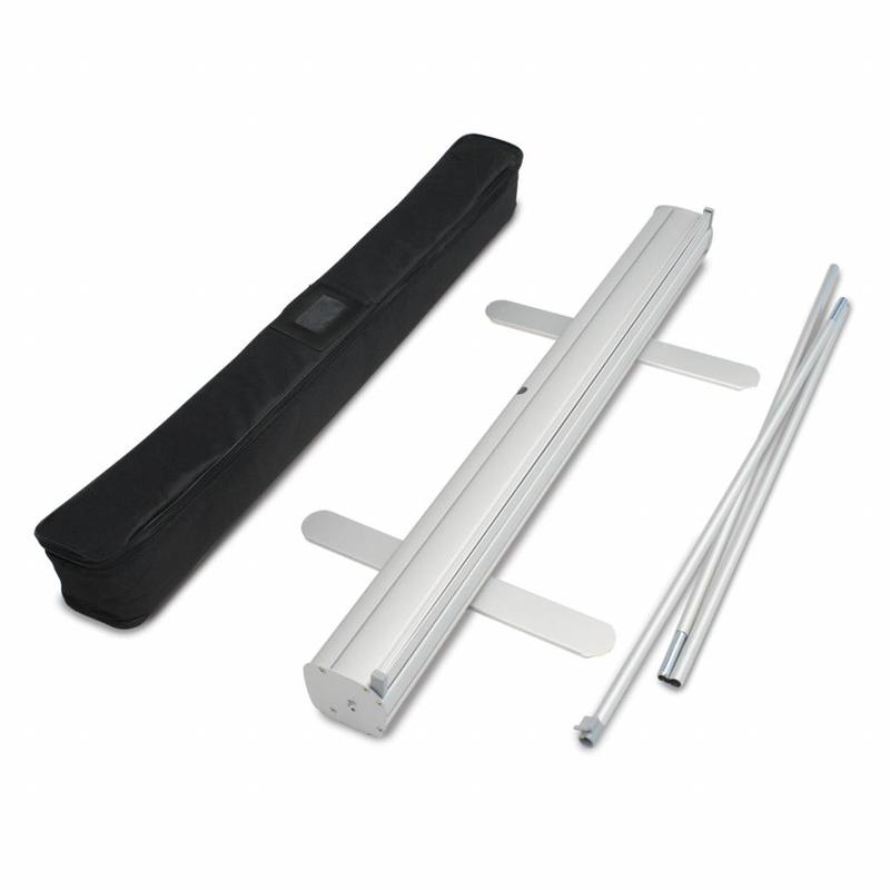 Portable banner display that can be used for advertising, promotions, or branding purposes. They consist of a vinyl or fabric banner that is attached to a retractable stand that allows the banner to be easily rolled up and stored when not in use.