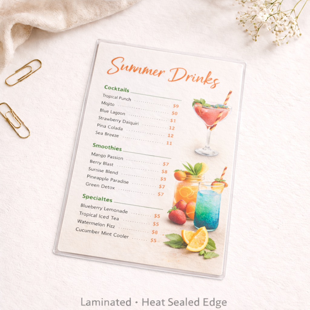 Laminated menus for easy cleaning and long-term use. Double-sided lamination (3mil × 2), water/scuff resistant, standard trim included.